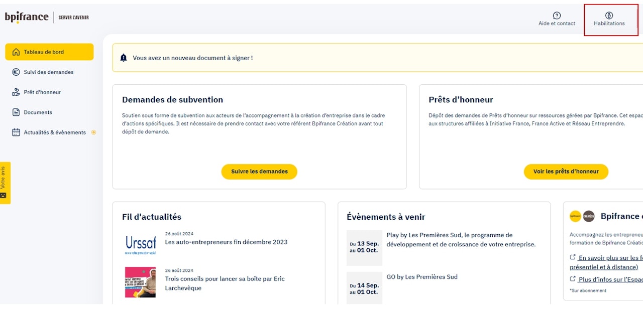 Il est possible de visualiser et gérer les utilisateurs qui ont accès aux demandes de votre structure en cliquant sur l'onglet "habilitations" en haut à droite de a page .