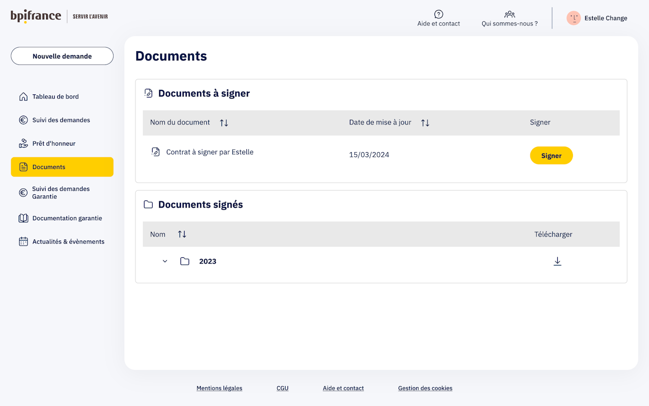 Une fois la demande acceptée, pour retrouver l'ensemble des contrats à signer, rendez-vous sur l'onglet Documents à signer de votre espace Bpifrance en ligne.