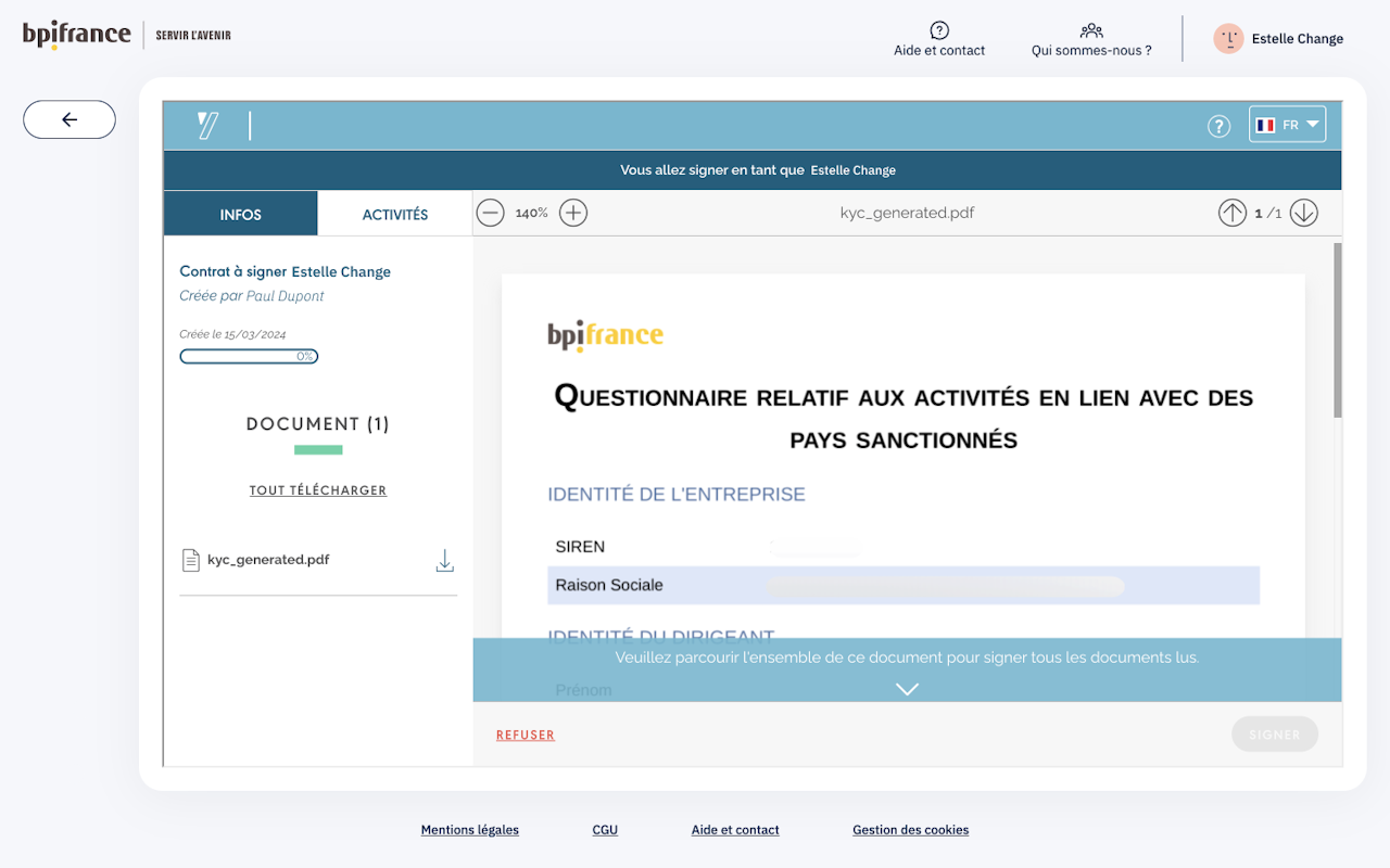 Pour chaque demande acceptée à signer, une page Yousign contenant le contrat est disponible.