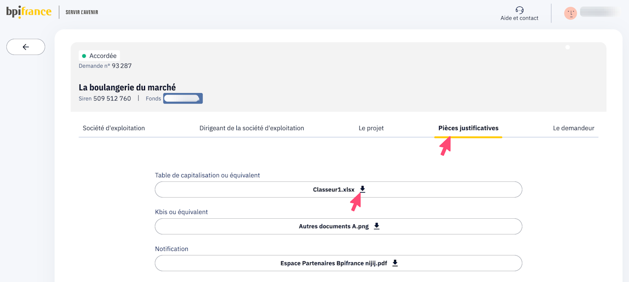 L'ensemble des documents déposés ainsi que les documents transmis par Bpifrance sont disponibles au téléchargement depuis le détail de la demande, à l'onglet "pièces justificatives".